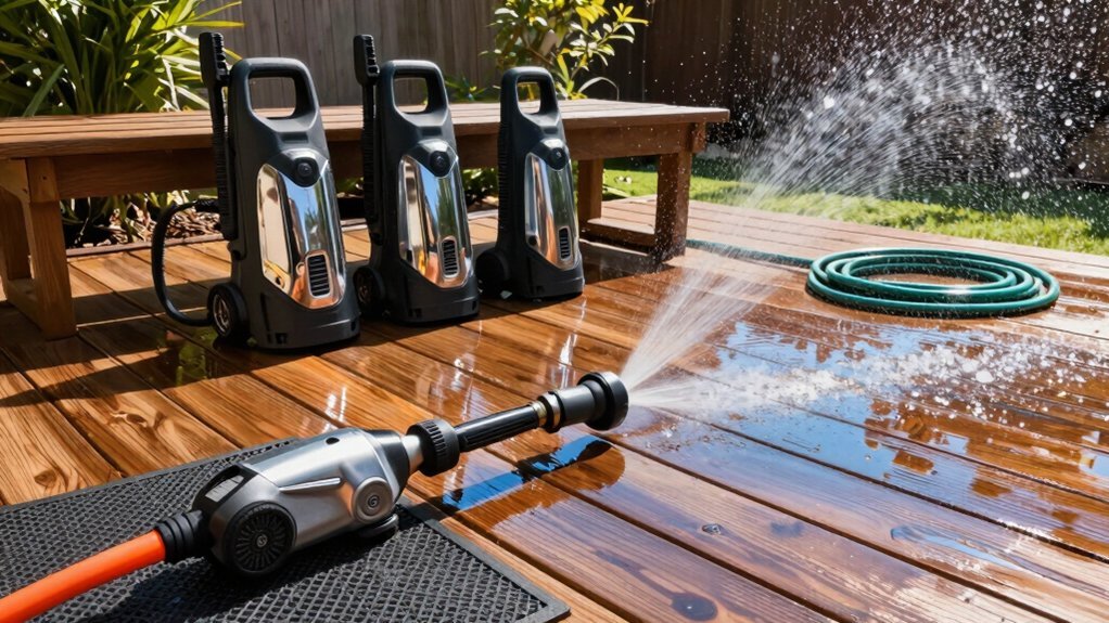 Think of a fresh‑painted deck as a canvas waiting for a master’s brush—only the brush is a high‑performance power washer. You’ll find models that pair 2.6 GPM and 2500 PSI with foam cannons, while others push 5000 PSI and 3.3 GPM through an 8‑level touchscreen. From gas‑driven 3400 PSI units to electric 1500‑watt options, each offers unique pressure, hose length, and nozzle configurations. The right choice hinges on your deck’s size, grime level, and how much control you want over the spray.